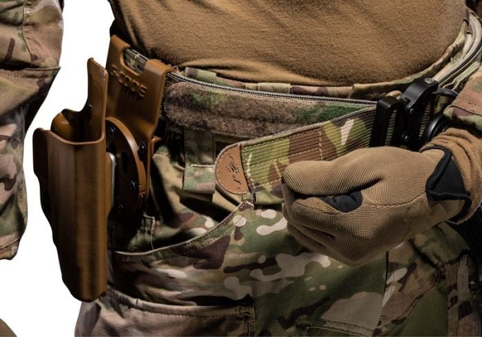 On the inner side there is a strip of Velcro® Ultra-Mate in neutral color, which, thanks to its excellent adhesion power, allows for a solid fixation on the COBRA Trousers Inner Belt. The thin profile of Ultra-Mate®, less rough and aggressive than commonly used velcro, helps in preserving the integrity of the rest of the equipment and clothing as well as eliminating any discomfort from rubbing on the hips caused by traditional tactical belts.