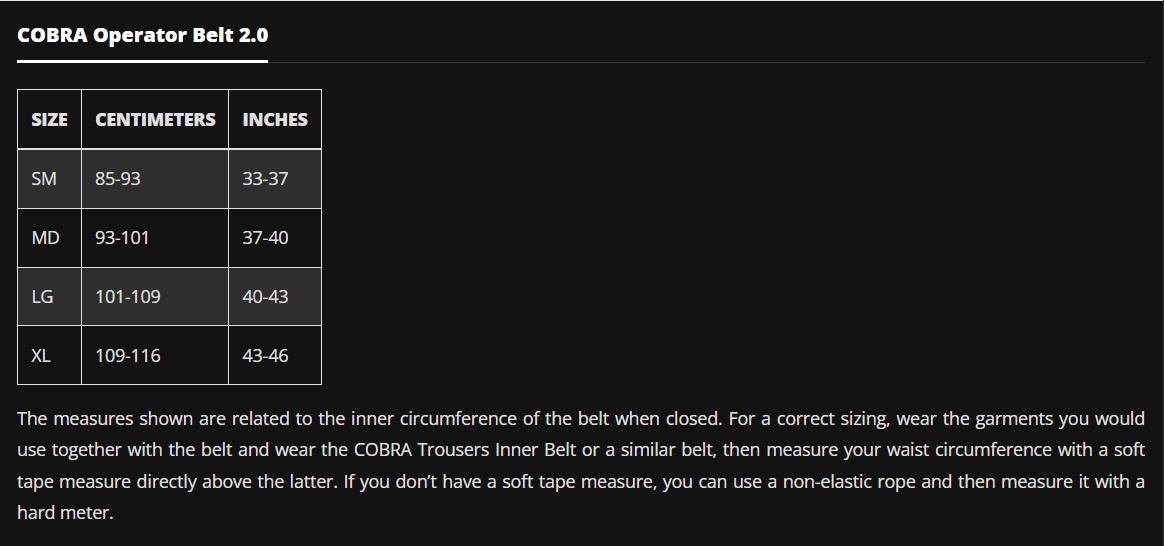 ATTENTION: The measures shown are related to the inner circumference of the belt when closed. For a correct sizing, wear the garments you would use together with the belt and wear the COBRA Trousers Inner Belt or a similar belt, then measure your waist circumference with a soft tape measure directly above the latter. If you don’t have a soft tape measure, you can use a non-elastic rope and then measure it with a hard meter.