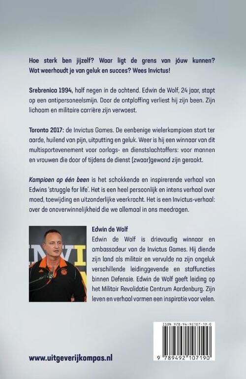 Srebrenica 1994, half negen in de ochtend. Edwin de Wolf, 24 jaar, stapt op een antipersoneelsmijn. Door de ontploffing verliest hij zijn been. Zijn lichaam en militaire carrière zijn verwoest. Toronto 2017: de Invictus Games. De eenbenige wielerkampioen stort ter aarde, huilend van pijn, uitputting en geluk. Weer is hij een winnaar van dit multi-sportevenement voor oorlogs- en dienstslachtoffers: voor mannen en vrouwen die door of tijdens de dienst (zwaar)gewond zijn geraakt. Kampioen op één been is het schokkende en inspirerende verhaal van Edwins ‘struggle for life’. Het is een heel persoonlijk en intens verhaal over moed, toewijding en uitzonderlijke veerkracht. Het is een Invictus-verhaal: over de onoverwinnelijkheid die we allemaal in ons meedragen. Hoe sterk ben jijzelf? Waar ligt de grens van jóuw kunnen? Wat weerhoudt je van geluk en succes? Wees Invictus!