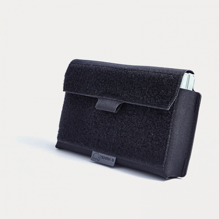 The discreet TERRA B Note Pouch Horizontal is made of CORDURA® 500 the laminate. Due to this material- and weight-reducing laser cut design, the Note Pouch is ideal as a low-profile organizer for carrying pads and notes horizontally.