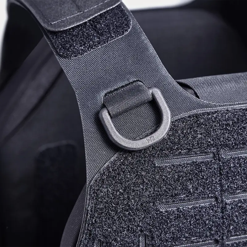 The D-rings on the front are attached for quick release of the plate carrier. When the ring is pulled, the lower part of the shoulder strap on the selected side is pulled forward, opening the shoulder section. A simple closing after the emergency opening is possible without any problems. You do not have to thread a steel cable or similar afterwards, as used by other manufacturers. Just put the desired length of the shoulder strap together. For an optimal use of the quick opening we recommend you to use the optional Elastic Cummerbund with ROC buckle.
