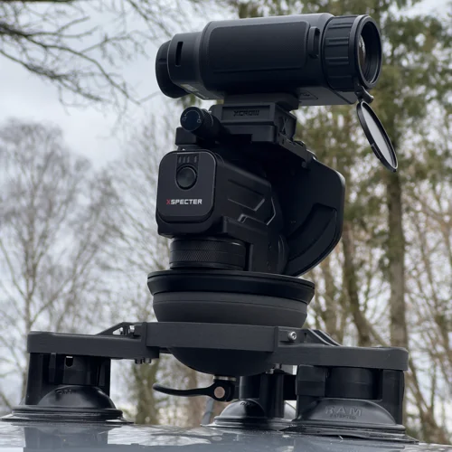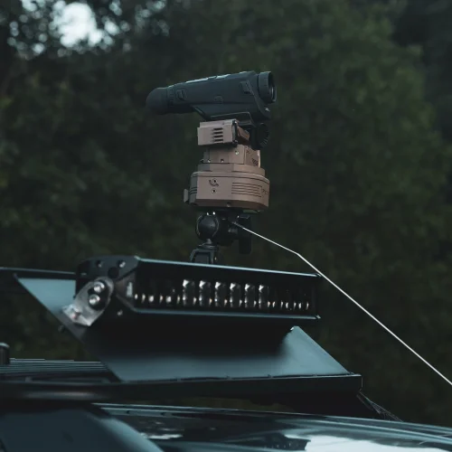 As a compact and mobile carrier system for handheld devices, such as thermal imaging and night vision devices, the XCROW M1 as part of the XSPECTER® CROW series enables the practical and convenient detection of living creatures and wild animals from inside the vehicle or from a secure environment. No more tiring approaching or identifying by hand, but thanks to the sensor-controlled and stabilized 360° rotation and specific tilt range, systematic and precise detection of any movement in the vicinity of the system location is possible.